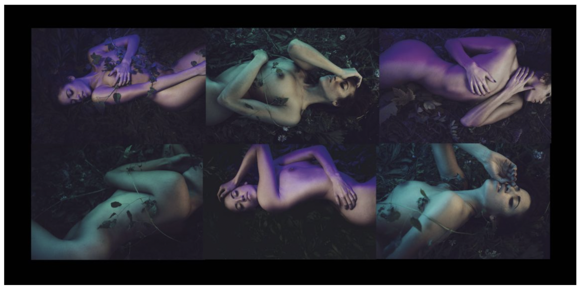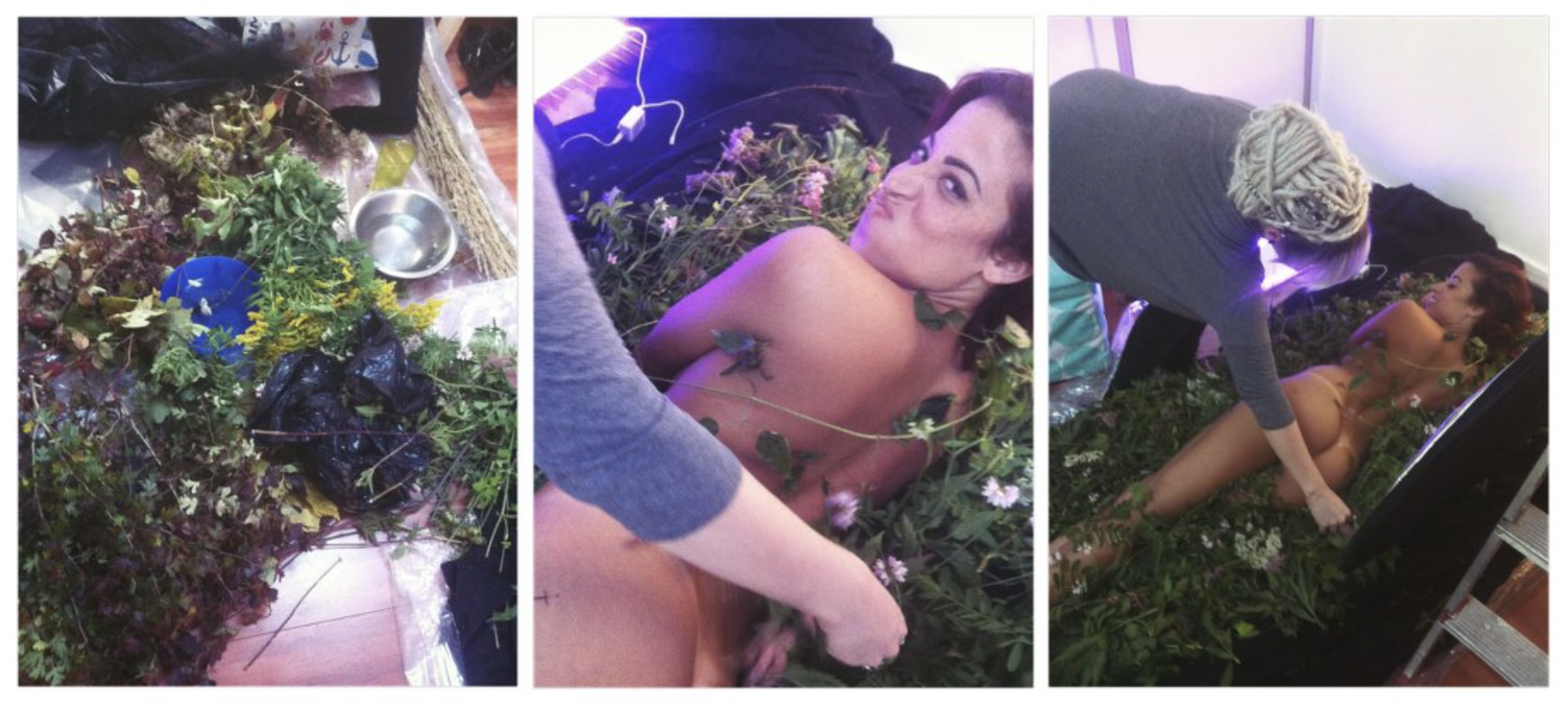 On the next day, Clara and Camille join me at home MY STUDIO (damn it!). The first idea was to take nude pictures in the middle of branches, so Camille could draw things afterwards upon them, in order to mix our two artistic worlds. The organic side of the leaves would remind the delicate universe of Delicate Distorsion, that is inspired by nature.